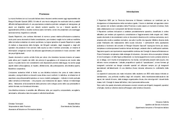 Il Repertorio BES per la Provincia Autonoma di Bolzano costituisce un contributo per la divulgazione ed interpretazione della normativa vigente. Il lavoro è destinato ad agevolare coloro che operano nel contesto scolastico della Provincia e vuole essere un momento di sintesi, frutto della collaborazione con i componenti del Servizio Inclusione. Il Repertorio contiene indicazioni a carattere prevalentemente operativo, classificate in ordine alfabetico per rendere più agevole la consultazione e l ' aggiornamento delle singole voci. Infatti, questo strumento è da considerarsi come un documento dinamico ed in continua evoluzione, sia in relazione alle novità a carattere normativo, sia sotto il profilo che riguarda l ' effettivo divenire delle prassi finalizzate alla realizzazione della scuola inclusiva. I cambiamenti nella popolazione scolastica e l’ evolversi del concetto di“ Bisogni Educativi Speciali” impongono forme più ampie, complesse e contemporanee di analisi e lettura dei bisogni, andando oltre le certificazioni sanitarie. Sappiamo quanto sia importante la responsabilità condivisa dei Consigli di classe nell’ elaborare un Piano d’ intervento complessivo delle strategie di inclusione, che vanno oltre una semplice richiesta di ore di sostegno o di altre figure professionali. Le risorse aggiuntive non sono persone esterne a cui si delega, con il rischio di emarginazione, ma risorse, normalmente presenti nelle scuole, che attivano nuove competenze. L’ attuale prospettiva è quella di“ specializzare”, ovvero formare gli insegnanti curricolari sui bisogni educativi speciali ed utilizzare sempre più gli insegnanti specializzati nell’ allestimento di una didattica d’ aula inclusiva attraverso la contitolarità delle attività. La capacità di assicurare una reale inclusione dello studente con BES nella classe richiede un cambiamento, una profonda modifica degli stili educativi, della trasmissione-elaborazione dei saperi, dei metodi di lavoro, delle strategie organizzative d’ aula, che coinvolge tutti i docenti della classe, tutti i Consigli di classe dell’ istituto, tutto il personale della scuola. Sono certo che questo strumento potrà essere un aiuto concreto per dirigenti, insegnanti, operatori e famiglie, dando un ulteriore slancio all’ impegno sulla tematica Inclusione.