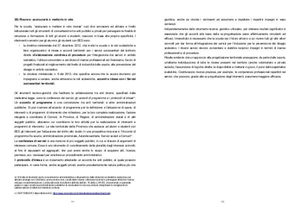 Gli strumenti tecnico-giuridici che facilitano la collaborazione tra enti diversi, specificati dalla medesima legge, sono le conferenze dei servizi, gli accordi di programma e i protocolli di intesa 60. Un accordo di programma è una convenzione tra enti territoriali e altre amministrazioni pubbliche. Si può ricorrere all ' accordo di programma per la definizione e l ' attuazione di opere, di interventi o di programmi di intervento che richiedono, per la loro completa realizzazione, l ' azione integrata e coordinata di Comuni, di Province, di Regioni, di amministrazioni statali e di altri soggetti pubblici, attraverso cui coordinano le loro attività per la realizzazione di interventi e programmi di intervento. La rete territoriale della Provincia che assicura ad alunni e studenti con BES gli interventi per l ' attuazione del diritto allo studio in una prospettiva inclusiva è l ' Accordo di programma fra scuole, amministrazione provinciale, Aziende sanitarie, Servizi sociali e Comuni 61. La conferenza di servizi è una riunione di più soggetti pubblici, in cui si discute di argomenti di interesse comune. Essa è uno strumento di coordinamento della pluralità degli interessi coinvolti, al fine di soppesarli ed aggregarli, che può avere anche lo scopo di acquisire atti, licenze, permessi, ecc. necessari per emettere un procedimento amministrativo. Il protocollo d ' intesa è un documento attestante un accordo tra enti pubblici, al quale possono partecipare, in varia forma, anche soggetti privati, avente prevalentemente natura politica più che