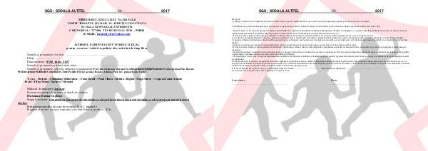 Declar că: a) Înţeleg că există riscul de vătămare asociat activităţilor fizice şi sportive menţionate mai sus şi sunt de acord ca propriul meu copil să participe la acestea, cu excepţia:.............................................................................................................. b) Menţionez că regimul medical permanent sau temporar al copilului meu, inclusiv regimul de dietă, cel de medicaţie şi / sau necesitatea utilizării aparatelor auditive sau vizuale, este:................................................................................... c) Sunt de acord ca, în cazul unei urgenţe de vătămare sau îmbolnăvire a copilului, cadrul didactic însoţitor să mă înştiinţeze imediat, să ia legătura cu o unitate medicală specializată, să acţioneze în numele meu şi să obţină tratamentul medical al copilului. Mă oblig să plătesc suma aferentă, în cazul administrării unui tratament medical contra cost. d) Sunt de acord ca propriul meu copil să se comporte civilizat şi responsabil, să respecte regulile stabilite şi accept consecinţele în situaţia în care nu se va comporta ca atare. e) Accept că sunt responsabil pentru aducerea şi preluarea copilului Ia orele şi locaţiile precizate anterior. înţeleg faptul că propriul meu copil va fi însoţit pe toată perioada excursiei de un cadru didactic însoţitor. f) Accept că rămâne la latitudinea şcolii să modifice aspectele legate de transport, cazare şi alte servicii, după cum consideră necesar. înţeleg că voi fi informat asupra acestor modificări cu cel puţin 24 de ore înaintea plecării. g) Sunt de acord că şcoala nu poate fi responsabilă pentru acţiunile operatorilor de transport sau de turism care îşi oferă serviciile pentru această excursie. h) Sunt de acord şi înţeleg că sunt responsabil pentru faptele copilului meu. Absolv şcoala de toate obligaţiile şi răspunderea ocazionate de această excursie, cu excepţia celor cauzate de neglijenţa cadrelor didactice însoţitoare. i) Înţeleg că deţinerea şi consumul de tutun, băuturi alcoolice şi droguri sunt interzise şi am discutat acest lucru cu copilul meu. Sunt de acord ca propriul meu copil să fie supus procedurilor disciplinare şi unei posibile anchete, dacă va consuma alcool sau va deţine astfel de substanţe psihotrope. j) Înţeleg faptul că elevii care nu respectă regulamentul de organizare şi funcţionare a unităţilor de învăţământ preuniversitar şi regulamentul intern al şcolii pot să fie excluşi de şcoală de pe lista participanţilor la astfel de manifestări. k) Sunt de acord că, în cazul în care copilul meu comite o faptă gravă pe perioada excursiei, rămâne la latitudinea şcolii să îmi trimită copilul acasă, eu fiind informat asupra acestui lucru în prealabil. În acest caz, voi suporta toate cheltuielile ocazionate de plecarea lui anterioară şi nu voi solicita returnarea niciunei sume din partea şcolii. În cazul elevului minor, voi veni să îmi preiau copilul şi voi suporta toate cheltuielile ocazionate de plecarea lui anterioară anticipată, fără a solicita returnarea niciunei sume din partea şcolii. l) în caz de urgenţă, pot fi găsit, 24 de ore, la următoarele numere de telefon:................................................ Date de contact suplimentare:....................................................................................................... m) Sunt de acord ca propriul meu copil să participe la această excursie.