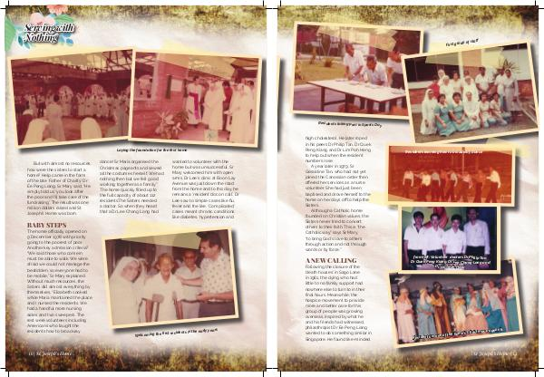 dance! Sr Maria organised the Christmas pageants and sewed all the costumes herself. We had nothing then but we felt good working together as a family.” The home quickly filled up to the full capacity of about 112 residents. The Sisters needed a doctor. So when they heard that a Dr Lee Chang Long had wanted to volunteer with the home but was unsuccessful, Sr Mary welcomed him with open arms. Dr Lee’ s clinic at Boon Lay Avenue was just down the road from the home and to this day, he remains a‘ resident doc on call’. Dr Lee saw to simple cases like flu, fever and the like.‘ Complicated’ cases meant chronic conditions like diabetes, hypertension and