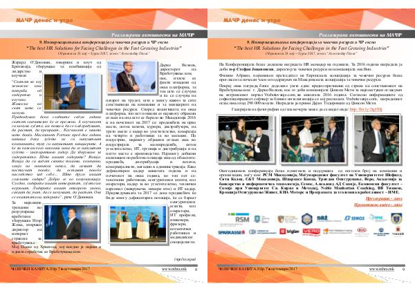 9. Интернационална конференција за човечки ресурси и ЧР експо“ The best HR Solutions for Facing Challenges in the Fast Growing Industries” Одржана на 31 мај— 1 јуни 2017, хотел“ Александар Палас”