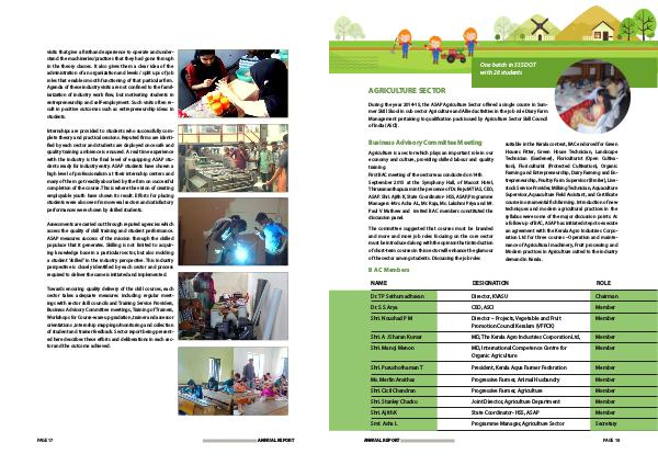 The committee suggested that courses must be branded and more and more job roles focusing on the core sector must be introduced along with the opinion that introduction of short-term courses in this sector will enhance the glamour of the sector among students. Discussing the job roles suitable in the Kerala context, BAC endorsed for Green Houses Fitter, Green House Technician, Landscape Technician( Gardener), Floriculturist( Open Cultivation), Floriculturist( Protected Cultivation), Organic Farming and Entrepreneurship, Dairy Farming and Entrepreneurship, Poultry Farm Supervisor( Broiler), Livestock Service Provider, Milking Technician, Aquaculture Supervisor, Aquaculture Field Assistant, and Certificate course in ornamental fish farming. Introduction of new techniques and modern agricultural practices in the syllabus were some of the major discussion points. As a follow up of BAC, ASAP has initiated steps to execute an agreement with the Kerala Agro Industries Corporation Ltd for three courses – Operation and maintenance of Agricultural machinery, Fruit processing and Modern practices in Agriculture suited to the industry demand in Kerala.