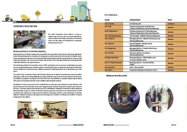 Identification of new courses and job roles constituted the core discussion point. Numerous courses relevant to the present scenario in the construction sector were suggested by the members. Support from experts were ensured in the areas- Curriculum vetting and Internships, new course identification, utilization of networks to enable quality and timely internship, support to ASAP in its Training of Trainer programme and provision of competent trainers to ASAP according to the requirements. Support was also offered in developing modules on new technologies & software, syllabus of Quantity Surveyor, incorporating new technologies and modules on software and modules on disaster management in the syllabus.