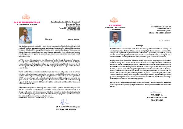 ASAP continues its journey to make a significant impact upon the quality of human resource pool in the state. The report of the year 2014-15 is a record of the continuous efforts and the achievements made through a collaborative effort involving various stake holders including educational institutions, industry bodies and training service providers. The ambitious targets set by the programme drives the various initiatives and create the momentum for achieving the results. I wish the team more success and fulfillment of all the dreams.
