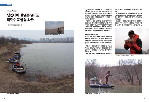 겨울 보팅 전주 기지지 낚싯대에 살얼음 얼어도 마릿수 찌올림 화끈 | 최정규 객원기자, 전북피싱클럽 회장 | 연밭 공략을 위해 삭은 연대를 정리하고 있다. 기지지 상류 연안에서 보트를 폈다. 92