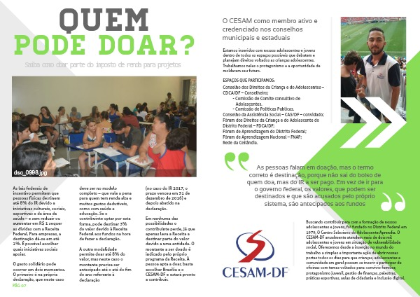 Buscando contribuir para com a formação de nossos adolescentes e jovens, foi fundado no Distrito Federal em 1979, O Centro Salesiano do Adolescente Aprendiz. O CESAM-DF anualmente atendem mais de dois mil adolescentes e jovens em situação de vulnerabilidade social. Oferecemos desde a inserção no mundo do trabalho a simples e importante ação de abrir nossas portas todos os dias para que crianças, adolescentes e comunidade em geral possam se inserir e participar de oficinas com temas voltados para: convívio familiar, protagonismo juvenil, gestão de finanças, palestras, práticas esportivas, aulas de cidadania e inclusão digital.