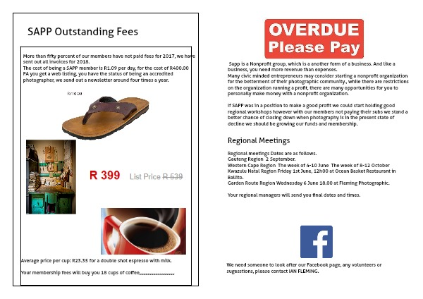 The cost of being a SAPP member is R1.09 per day, for the cost of R400.00 PA you get a web listing, you have the status of being an accredited photographer, we send out a newsletter around four times a year.