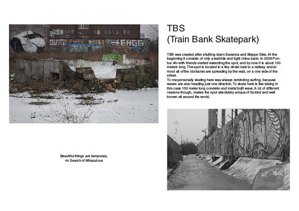 TBS was created after shutting down Savanna and Steppe Side. At the beginning it consists of only a wallride and tight china bank. In 2009 Pontus Alv with friends started extending the spot, and by now it is about 100 meters long. The spot is located in a tiny street next to a railway and almost all of the obstacles are spreading by the wall, on a one side of the street. To me personally skating here was always reminding surfing, because waves are also heading just one direction. To skate here is like taking in this case 100 meter long concrete and metal built wave. A lot of different reasons though, makes the spot absolutely unique of its kind and well known all around the world.