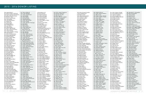 Mr. & Mrs. Enrique Castellat S. Joy Castiglione, OP Mrs. Benita Castro Mrs. Marie Castrogiovanni Mrs. Cornelia F. Catera Ms. Catherine Loeffler Mr. Frank Caulson Ms. Joan Cavaco Mrs. Hannah Cavallaro Ms. Arlene N. Cavallo Ms. Agatha Cavoli Mrs. Frances Cavolo Mrs. Joy Cavorsi Ms. Mary G. Ceccoli Ms. Christina Cedrone Mr. & Mrs. Thomas Cepo Ms. Emilie Cerar Mr. & Mrs. Stephen Cerow Mr. & Mrs. Albert Cerullo Mrs. Paul Cesare Ms. Rose Cevoli Ms. Kathryn C. Chabot Mr. & Mrs. Ronald Chalmers Ms. Elaine Chambers Mrs. Eleanor Chambers Ms. Jane E. Chambers Mr. Joe Chan Mr. & Mrs. Stephen Chertock Mr. & Mrs. Angelo Chiapperino Ms. Mary Chiappone Mr. & Mrs. Tom Chiarella Ms. Rose Marie Chimienti Mr. & Mrs. Michael Christiano Mr. & Mrs. Robert Christiansen Mr. James Christie Dr. Elizabeth Chung Mr. Bernard Chunta Mrs. Louise Ciaccio Mr. Michael Ciampa Mrs. Stella Ciborowski Ms. Felicia Ciesinski Mr. & Mrs. Ron Ciesinski Mrs. Rosaria Ciesla Mrs. Mary Ann Cifarelli Mrs. Caroline Cimaszewski Mr. Philip Ciminelli Mr. Leo Cimini Ms. Diane Cioffi Ms. Gloria Cipriano Ms. Patricia Cipriano Mr. & Mrs. Pasquale Cirincione Mrs. Anna Cisek Mr. Joseph Clancy Mr. Alexander Clark Mrs. Carol Ann Clark Mr. & Mrs. Charles Clark Miss Diane Clark Ms. Florence Clark Ms. Maria Clark Ms. Mariel Clark Mr. Robert Clark Ms. Carianne Clarke Ms. Irene Clarke Mr. Vincent J. Clarke Mr. & Mrs. Walter F. Clegg Mr. Charles Clements Ms. Joan Clifford Mrs. Teresa Clifford |