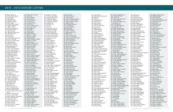 Ms. Carolyn Pinto Mr. & Mrs. Bryant Piontkowski Ms. Marie Pira Mr. John Pirc Ms. Geraldine Pirozzi Ms. Kasia Pisarski Ms. Irene Piscopo Mr. Anthony Pititto Mr. & Mrs. Rafael Planos Mr. Edward Platt Ms. Eileen Plenge Mr. William Plunkett Ms. Jeanne Podmore Ms. J. Pojero Mrs. Joanna Polistena Mr. & Mrs. Robert Polit Ms. Sophia Pollack Mr. & Mrs. John Pollmann Dr. & Mrs. Robert Polowczyk Mrs. Catherine Pomerico Mrs. Maureen Pontillas Mrs. Theresa Pontrello Mrs. Toni Poolin Mr. & Mrs. Thomas Pope Mr. Edward Porambo Mrs. Constance Towey Porcaro Mrs. Patricia Adams Porqueddu Mr. & Mrs. Frank J. Porstner Mrs. Kay Porter Mr. & Mrs. Richard Portuese Mrs. D. Porzio Mrs. Marie Positano Ms. Catherine Potenza Mr. & Mrs. Robert Power Ms. Evelyn Powers Mr. & Mrs. John Pozarowski Mrs. Marilyn Leone Pranzo Mr. John J. Prendergast Mrs. Margaret C. Price Mr. & Mrs. John Priest Ms. Holly Primavera Ms. Sharon Primavera Mr. Frank Prince Mr.& Mrs. Joseph Prinzivalli Mrs. Nancy Priola Mr. & Mrs. Elias W. Pritchard Mr. & Mrs. Frank Probeck, Jr. Mr. Matt Probert Mr. & Mrs. George Proferes Mrs. Eva Marie Proscia Mr. Crispin M. Proto Mr. & Mrs. Tom Prunte Ms. Cathy Prykuta Ms. Jean Przybeck Mr. & Mrs. Anthony Przybyszewski S. Regina Przywara, OP Mr. & Mrs. William Ptucha Mr. & Mrs. Edward Puerzer Mrs. Carol Jones Puff Mrs. Florence Puff Mr. Joseph Pugh Mr. & Mrs. Louis Pugliese Ms. Caren Puleo Ms. Aurora D. Pumares Mrs. Joanne Puntillo Mr. & Mrs. John Punturieri Mr. Robert Puppa Mrs. Betty Purschke |