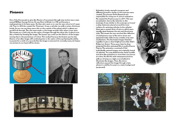 Animation slowly started to progress and different invention similar to the zoetrope were created. The pioneer Emile Reynaud, was responsible for rising era of cartoon animation. He created the Praxinoscope in 1877. This was an animation device the inheritor to the zoetrope. It was similar to the zoetrope as it used a strip of pictures placed around the inner surface of a spinning cylinder. In the cylinder there was a central drum of mirrors which were equally apart between the axis and the picture strip. This meant the toys revolved the reflection of each picture seen in the mirror drum and appeared static without any complex stop-start mechanisms. The illustrated images blended together to give a clear bright picture that didn't flicker nor distort. Three years later he then projected the first animated film in public,Pauvre Pierrot. The animation consisted of 500 individually painted images and originally lasted 15 minutes. You may think how he made it public and show the animation to more than one person at a time. He did this with transparent pictures with an oil lamp as a light source behind to illuminate the images. Then, the mirror reflections passed the image through a lens where it could be focused on a static background(projected).