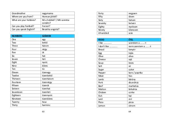 64 Forty negyven Fifty ötven Sixty hatvan Seventy hetven Eighty nyolcvan Ninety kilencven A hundred száz FOOD ÉTEL I like............. szeretem a.......-t I don ' t like............. nem szeretem a.......-t Bread kenyér Egg tojás Olive oliva Cheese sajt Soup leves Salt só Sugar cukor Pepper bors / paprika Meat hús Lamb bárány Pork disznóhús Beef marhahús Mutton birkahús Chicken csirke Fish hal Lard zsír Pizza pizza Lemon citrom