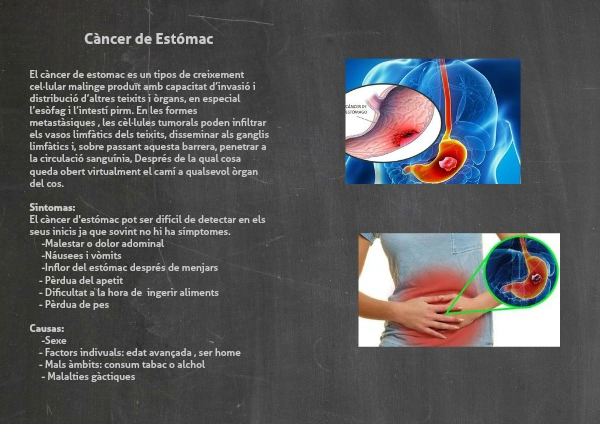 El càncer de estomac es un tipos de creixement cel·lular malinge produït amb capacitat d’invasió i distribució d’altres teixits i òrgans, en especial l’esòfag i l’intestí pirm. En les formes metastàsiques , les cèl·lules tumorals poden infiltrar els vasos limfàtics dels teixits, disseminar als ganglis limfàtics i, sobre passant aquesta barrera, penetrar a la circulació sanguínia, Després de la qual cosa queda obert virtualment el camí a qualsevol òrgan del cos.