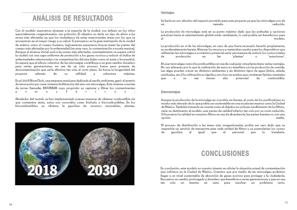En conclusión, este modelo es nuestro intento en aliviar la situación actual de contaminación que sufrimos en la Ciudad de México. Creemos que por medio de las microalgas podemos llegar a un nivel sustentable de absorción de gases nocivos para proteger a la ciudadanía. Buscamos un cambio prolongado y duradero que beneficie a varias generaciones y que no sea tan solo un intento en vano para resolver un problema serio.