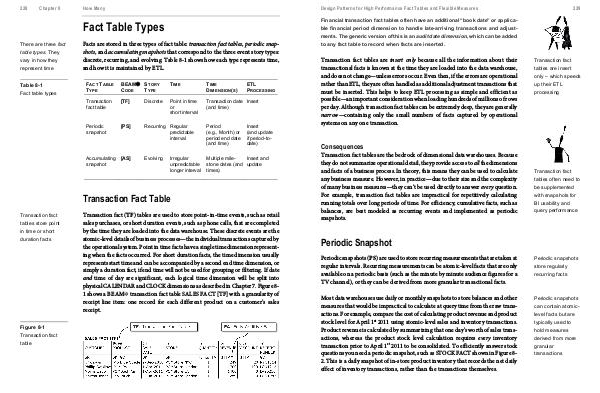 Facts are stored in three types of fact table: transaction fact tables, periodic snap-