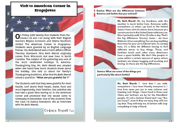 The Students said that they were grateful for their health, roof above their heads, water, food and most importantly, their families. She said that she had had a great time having us in the American corner and promised that she would come to Gimnazija in December. One of the students from the class I-9 Danica Komatovic did an interview with Ms.Beth Wendt.
