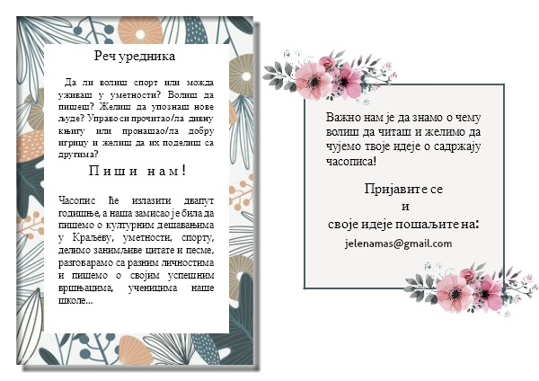 Часопис ће излазити двапут годишње, а наша замисао је била да пишемо о културним дешавањима у Краљеву, уметности, спорту, делимо занимљиве цитате и песме, разговарамо са разним личностима и пишемо о својим успешним вршњацима, ученицима наше школе...
