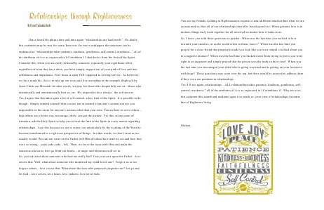 You see my friends, walking in Righteousness requires a total different mindset than what we are accustomed to, thus all of our relationships should be based upon love. When genuine love is in motion, things truly work together for all involved no matter how it looks to us. So, I leave you with these questions to ponder: When was the last time you walked in love towards your enemies, or as the world refers to them, haters? When was the last time you prayed for a close friend that purposely made you look like you were stupid or talked about you in a negative manner? When was the last time you backed down from trying to prove you were right in an argument and simply prayed that the person sees the truth on their own? When was the last time you encouraged your child who is going wayward and is getting on your last nerve with hope? These questions may seem over the top, but there would be no need to address them if they were not pertinent to relationships. Yes, Iā ll say again, relationships ⦠ALL relationships takes patience, kindness, gentleness, selfcontrol, meekness.ā all of the attributes of love as expressed in I Corinthians 13. Why not visit this scripture this month and meditate upon it so much so, your view of relationships becomes that of Righteous living.