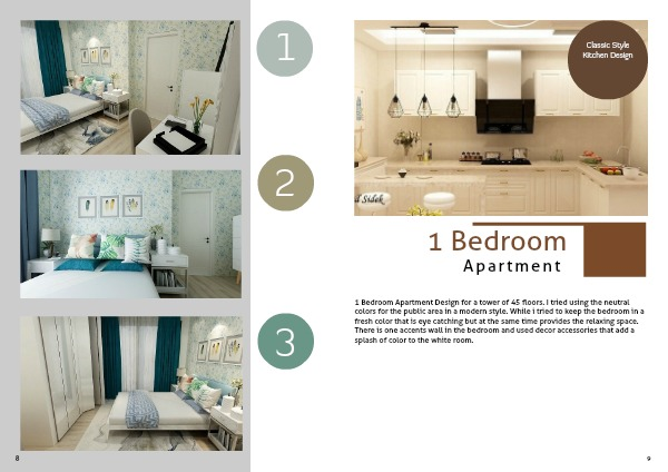 1 Bedroom Apartment Design for a tower of 45 floors. I tried using the neutral colors for the public area in a modern style. While i tried to keep the bedroom in a fresh color that is eye catching but at the same time provides the relaxing space. There is one accents wall in the bedroom and used decor accessories that add a splash of color to the white room.