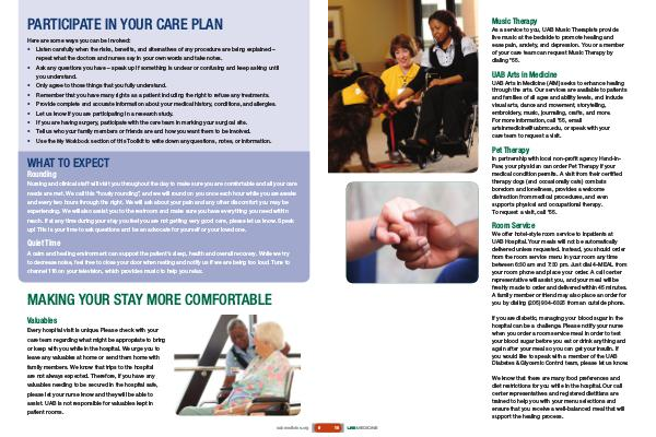 Every hospital visit is unique. Please check with your care team regarding what might be appropriate to bring or keep with you while in the hospital. We urge you to leave any valuables at home or send them home with family members. We know that trips to the hospital are not always expected. Therefore, if you have any valuables needing to be secured in the hospital safe, please let your nurse know and they will be able to assist. UAB is not responsible for valuables kept in patient rooms. uabmedicine. org 9