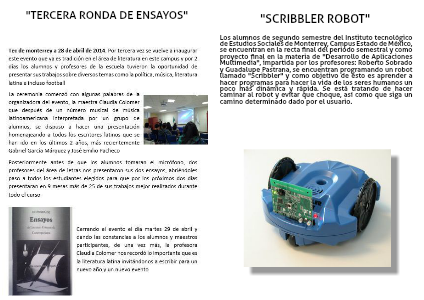 Los alumnos de segundo semestre del Instituto tecnológico de Estudios Sociales de Monterrey, Campus Estado de México, se encuentran en la recta final del periodo semestral y como proyecto final en la materia de "Desarrollo de Aplicaciones Multimedia", impartida por los profesores: Roberto Sobrado y Guadalupe Pastrana, se encuentran programando un robot llamado "Scribbler" y como objetivo de esto es aprender a hacer programas para hacer la vida de los seres humanos un poco más dinámica y rápida. Se está tratando de hacer caminar al robot y evitar que choque, así como que siga un camino determinado dado por el usuario.