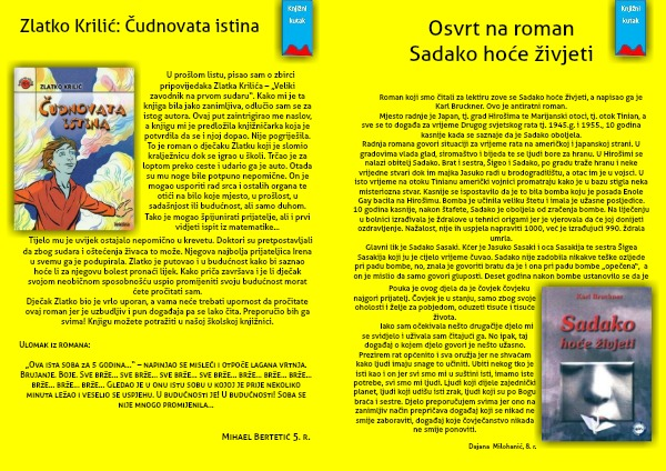 Glavni lik je Sadako Sasaki. Kćer je Jasuko Sasaki i oca Sasakija te sestra Šigea Sasakija koji ju je cijelo vrijeme čuvao. Sadako nije zadobila nikakve teške ozljede pri padu bombe, no, znala je govoriti bratu da je i ona pri padu bombe „opečena“, a on je mislio da samo govori gluposti. Deset godina nakon bombe ustanovilo se da je Sadako smrtno bolesna.