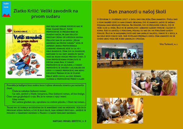 U četvrtak 9. studenog 2017. u školi smo obilježili Dan znanosti. Otišli smo u osmi razred gdje su nam osmaši objasnili što je znanost, zašto je važna i pokazali nam nekoliko pokusa. Na primjer, što to proizvodi struju, što je teže: ulje ili voda. Bilo mi je zanimljivo i zabavno gledati pokuse i slušati o njima. Kad su završili s pokusima, pozvali su nas da i mi pokušamo izvesti pokuse. Bilo mi ja najzanimljivije kad sam zapalio salvetu, stavio je u bocu, a na grlo boce stavio jaje. Jaje je polako propalo u bocu. Dan znanosti mi se svidio zbog toga jer je bio zanimljiv i poučan.