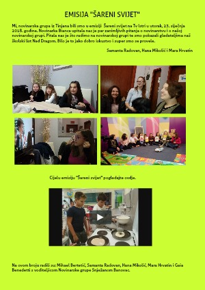 Mi, novinarska grupa iz Tinjana bili smo u emisiji Šareni svijet na Tv Istri u utorak, 23. siječnja 2018. godine. Novinarka Bianca upitala nas je par zanimljivih pitanja o novinarstvu i o našoj novinarskoj grupi. Pitala nas je što radimo na novinarskoj grupi te smo pokazali gledateljima naš školski list Nad Dragom. Bilo je to jako dobro iskustvo i super smo se provele.