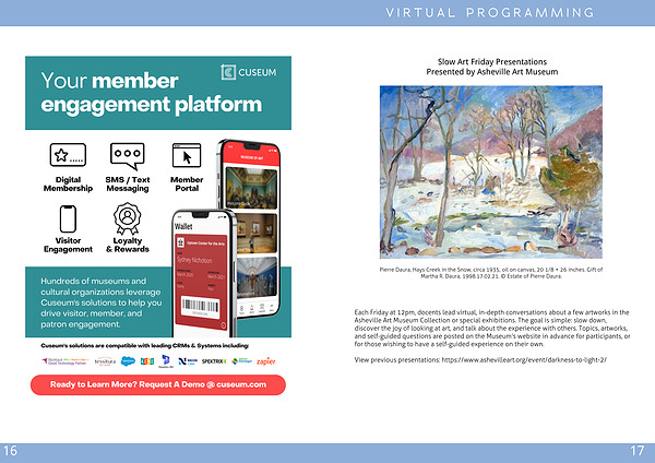 Each Friday at 12pm, docents lead virtual, in-depth conversations about a few artworks in the Asheville Art Museum Collection or special exhibitions. The goal is simple: slow down, discover the joy of looking at art, and talk about the experience with others. Topics, artworks, and self-guided questions are posted on the Museum’s website in advance for participants, or for those wishing to have a self-guided experience on their own.
