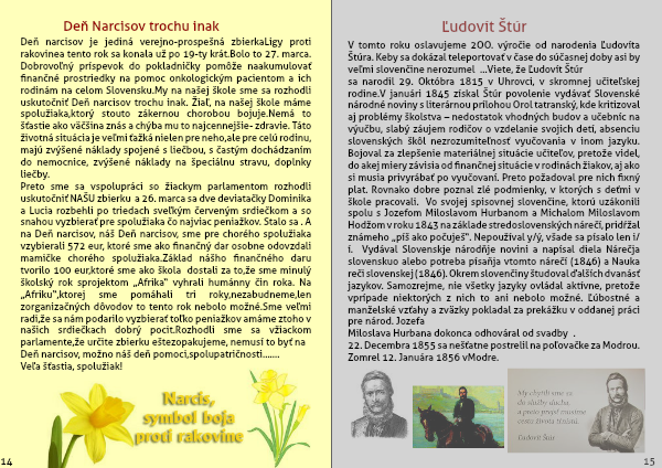 Deň narcisov je jediná verejno-prospešná zbierka Ligy proti rakovine a tento rok sa konala už po 19-ty krát.Bolo to 27. marca. Dobrovoľný príspevok do pokladničky pomôže naakumulovať finančné prostriedky na pomoc onkologickým pacientom a ich rodinám na celom Slovensku.My na našej škole sme sa rozhodli uskutočniť Deň narcisov trochu inak. Žiaľ, na našej škole máme spolužiaka,ktorý s touto zákernou chorobou bojuje.Nemá to šťastie ako väčšina z nás a chýba mu to najcennejšie- zdravie. Táto životná situácia je veľmi ťažká nielen pre neho,ale pre celú rodinu, majú zvýšené náklady spojené s liečbou, s častým dochádzaním do nemocnice, zvýšené náklady na špeciálnu stravu, doplnky liečby.