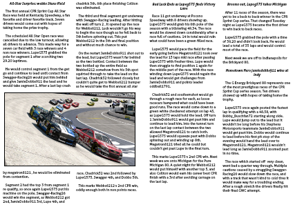 LupeG575 would pace the field for the early going before Megatron8121 took over the lead for 13 laps mid race after passing LupeG575 with fresher tires. Lupe would then struggle to find position 1 again for the middle part of the race. With the race winding down LupeG575 would regain the lead and would get challenges from JamieDobbs911 and points leader oddball1791.