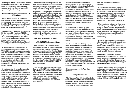Another caution would again bunch the field, and on the restart oddball finally got by dobbs after trying all race long. Dobbs would spin out off turn 4 which presumably ended his chances until a late caution by megatron8121 slapping the safer barrier and spinning would save him. On the final restart Oddball would bolt ahead but with two laps to go quickly got tight allowing Dobbs to catch. Heading into the last lap Dobbs was right on oddball, and off 2 pulled even. They remained even in 3 before Oddball got loose and jamiedobbs would prevail for his first ever CPR Victory. Oddball would then lose 2nd at the line to megatron, Chadrick came across 4th, timothy008 5th, chimchim 6th, and webbs6212 would be the only driver not on the lead lap finished 7th.