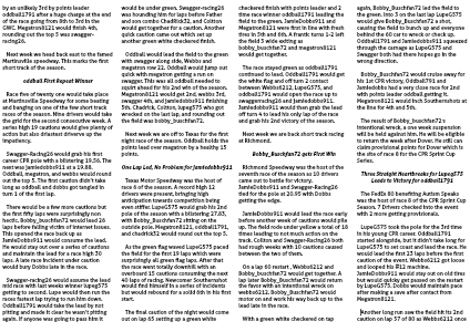 Oddball would lead the field to the green with swagger along side, Webbs and megatron row 22. Oddball would jump out quick with megatron getting a run on swagger. This was all oddball needed to squirt ahead for his 2nd win of the season. Megatron8121 would get 2nd, webbs 3rd, swagger 4th, and jamiedobbs911 finishing 5th. Chadrick, Coltton, lupeg575 who got wrecked on the last lap, and rounding out the field was bobby_buschfan72.