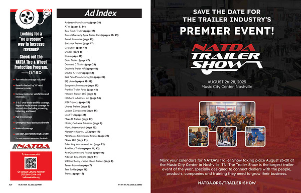 Anderson Manufacturing ( page 26 ) ATW ( pages 5 , 56 ) Bear Track Trailers ( page 47 ) Bostail ( Formerly Apex Trailer Parts ) ( pages 38 , 49 ) Brandt Industries ( page 39 ) Buckshot Trailers ( page 17 ) ClickLease ( page 18 ) Dexter ( page 3 ) Delco ( page 38 ) Delta Trailers ( page 47 ) Diamond C Trailers ( page 23 ) Doolittle Trailer MFG ( page 46 ) Double A Trailers ( page 51 ) East Penn Manufacturing Co . ( page 20 ) EQ United ( pages 32-33 ) Equipment Innovators ( page 51 ) Franklin Trailer Parts ( page 42 ) Hillcrest Trailers LLC ( page 9 ) Hillsboro Industries , Inc ( page 54 ) JKD Products ( page 21 ) Liberty Trailers ( page 2 ) Lippert Components ( page 31 ) Load Trail ( page 31 ) Maxx-D Trailers ( page 27 ) Motility Software Solutions ( page 8 ) Moritz International ( page 55 ) Norstar Industries , LLC ( page 19 ) Northpoint Commercial Finance ( page 39 ) Novae LLC ( page 41 ) Polar King International , Inc . ( page 13 ) RawMaxx Trailers ( pages 11 , 43 ) Red Oak Inventory Finance ( page 41 ) Ridewell Suspensions ( page 44 ) SH Distributing - Sport Haven Trailers ( page 6 ) Terran Industries ( page 7 ) Test Buddy ( page 16 ) Transax ( page 15 )