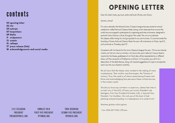 Should you have any comments or questions, please feel free to contact any of the NJCL officers, particularly President Lyle Seeligson, First Vice President Emmalee Volk, or Second Vice President Trini Kechkian. We wish you all the best of luck planning and participating in a masterpiece of a celebration!