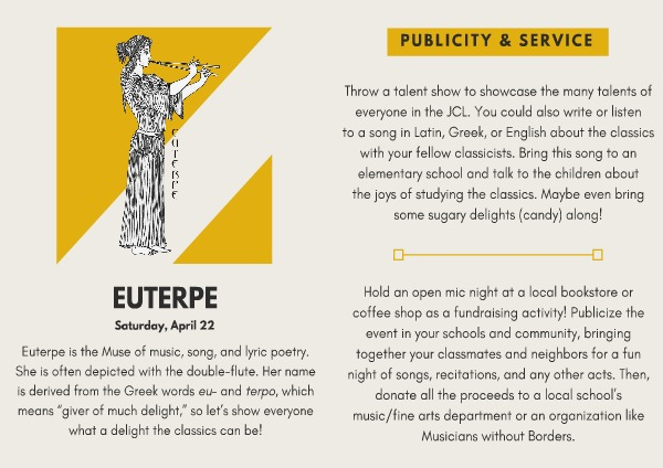 Throw a talent show to showcase the many talents of everyone in the JCL. You could also write or listen to a song in Latin, Greek, or English about the classics with your fellow classicists. Bring this song to an elementary school and talk to the children about the joys of studying the classics. Maybe even bring some sugary delights( candy) along!