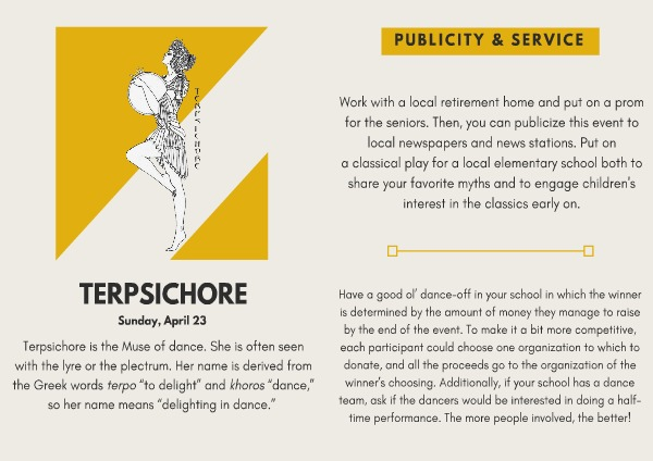 Work with a local retirement home and put on a prom for the seniors. Then, you can publicize this event to local newspapers and news stations. Put on a classical play for a local elementary school both to share your favorite myths and to engage children ' s interest in the classics early on.