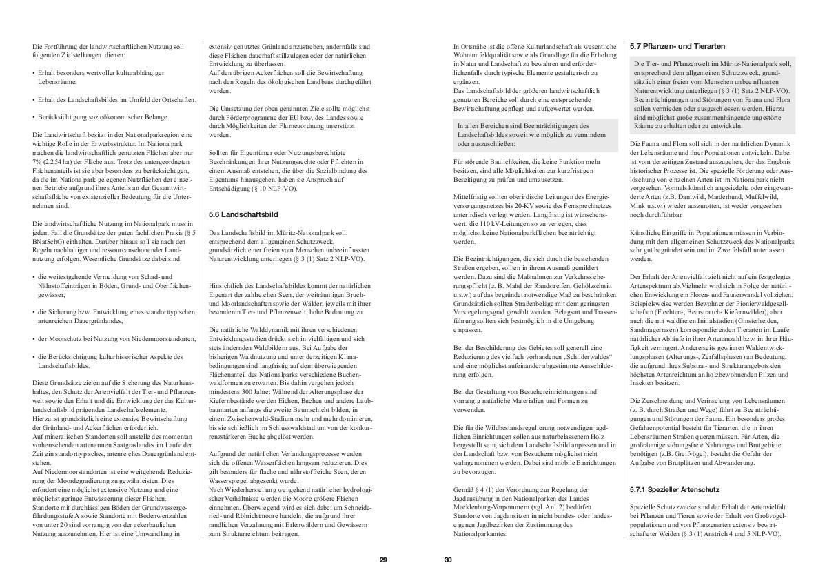 Die Tier- und Pflanzenwelt im Müritz-Nationalpark soll, entsprechend dem allgemeinen Schutzzweck, grundsätzlich einer freien vom Menschen unbeeinflussten Naturentwicklung unterliegen(§ 3( 1) Satz 2 NLP-VO). Beeinträchtigungen und Störungen von Fauna und Flora sollen vermieden oder ausgeschlossen werden. Hierzu sind möglichst große zusammenhängende ungestörte Räume zu erhalten oder zu entwickeln.