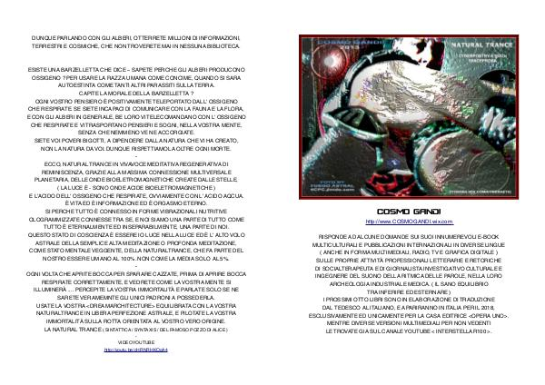 ESISTE UNA BARZELLETTA CHE DICE – SAPETE PERCHE GLI ALBERI PRODUCONO OSSIGENO? PER USARE LA RAZZA UMANA COME CONCIME, QUANDO SI SARA AUTOESTINTA COME TANTI ALTRI PARASSITI SULLA TERRA. CAPITE LA MORALE DELLA BARZELLETTA? OGNI VOSTRO PENSIERO È POSITIVAMENTE TELEPORTATO DALL ' OSSIGENO CHE RESPIRATE. SE SIETE INCAPACI DI COMUNICARE CON LA FAUNA E LA FLORA, E CON GLI ALBERI IN GENERALE, BE LORO VI TELECOMANDANO CON L ' OSSIGENO CHE RESPIRATE E VI TRASPORTANO PENSIERI E SOGNI, NELLA VOSTRA MENTE, SENZA CHE NEMMENO VE NE ACCORGIATE. SIETE VOI POVERI BIGOTTI, A DIPENDERE DALLA NATURA CHE VI HA CREATO, NON LA NATURA DA VOI. DUNQUE RISPETTIAMOLA OLTRE OGNI MORTE.- ECCO, NATURAL TRANCE IN VIVAVOCE MEDITATIVA REGENERATIVA DI REMINISCENZA, GRAZIE ALLA MASSIMA CONNESSIONE MULTIVERSALE PLANETARIA, DELLE ONDE BIOELETROMAGNETICHE CREATE DALLE STELLE,( LA LUCE È- SONO ONDE ACIDE BIOELETROMAGNETICHE) E L ' ACIDO DELL ' OSSIGENO CHE RESPIRATE, OVVIAMENTE CON L ' ACIDO AQCUA. È VITA ED È INFORMAZIONE ED È ORGASMO ETERNO. SI PERCHE TUTTO È CONNESSO IN FORME VIBRAZIONALI NUTRITIVE OLOGRAMMIZZATE CONNESSE TRA SE, E NOI SIAMO UNA PARTE DI TUTTO COME TUTTO È ETERNALMENTE ED INSEPARABILMENTE, UNA PARTE DI NOI. QUESTO STATO DI COSCIENZA È ESSERE IO LUCE NELLA LUCE ED È L ' ALTO VOLO ASTRALE DELLA SEMPLICE ALTA MEDITAZIONE O PROFONDA MEDITAZIONE, COME STATO MENTALE VEGGENTE, DELLA NATURALTRANCE, CHE FA PARTE DEL NOSTRO ESSERE UMANO AL 100 %. NON COME LA MEDIA SOLO AL 5 %.- OGNI VOLTA CHE APRITE BOCCA PER SPARARE CAZZATE, PRIMA DI APRIRE BOCCA RESPIRATE CORRETTAMENTE, E VEDRETE COME LA VOSTRA MENTE SI ILLUMINERÀ.... PERCEPITE LA VOSTRA IMMORTALITÀ E PARLATE SOLO SE NE SARETE VERAMEMNTE GLI UNICI PADRONI A POSSEDERLA. USATE LA VOSTRA < DREAMARCHITECTURE > EQUILIBRATA CON LA VOSTRA NATURALTRANCE IN LIBERA PERFEZIONE ASTRALE, E PILOTATE LA VOSTRA IMMORTALITÀ SULLA ROTTA ORIENTATA AL VOSTRO VERO ORIGINE. LA NATURAL TRANCE( SINTATTICA / SYNTAXIS / DEL FAMOSO POZZO DI ALICE)- VIDEO YOUTUBE http:// youtu. be / cHRNRHKOoA4
