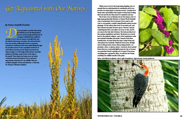 Below : Red-bellied woodpecker . Above right : Beautyberry . Opposite page : Seaside goldenrod .