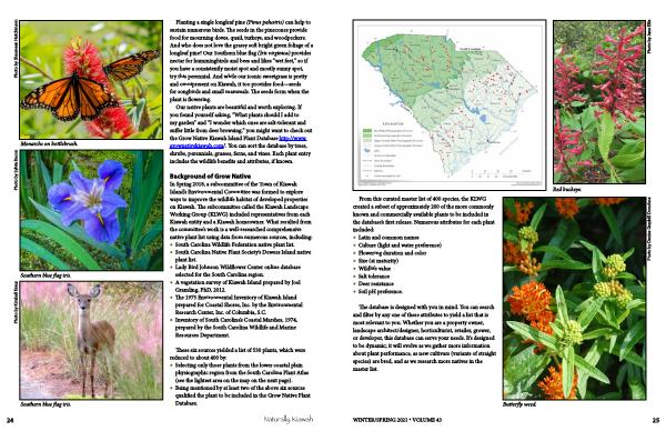 Our native plants are beautiful and worth exploring . If you found yourself asking , “ What plants should I add to my garden ” and “ I wonder which ones are salt-tolerant and suffer little from deer browsing ,” you might want to check out the Grow Native Kiawah Island Plant Database