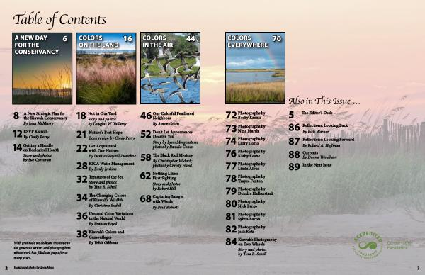 Colors everywhere 72 Photographs by Becky Krantz 76 Photographs by Kathy Keane 79 Photographs by Deirdre Halberstadt 81 Photographs by Sylvia Bacon 73 Photographs by Nina Marsh 77 Photographs by Linda Albus 80 Photographs by Nick Fargo 82 Photographs by Jack Kotz 74 Photographs by Larry Corio 78 Photographs by Trayce Fenton 70 5 The Editor ’ s Desk 86 Reflections : Looking Back By Rich Warner 87 Reflections : Looking Forward By Roland A . Hoffman 88 Currents By Donna Windham 89 In the Next Issue Also in This Issue … 3 84 Kiawah ’ s Photography on Two Wheels Story and photos by Tina R . Schell