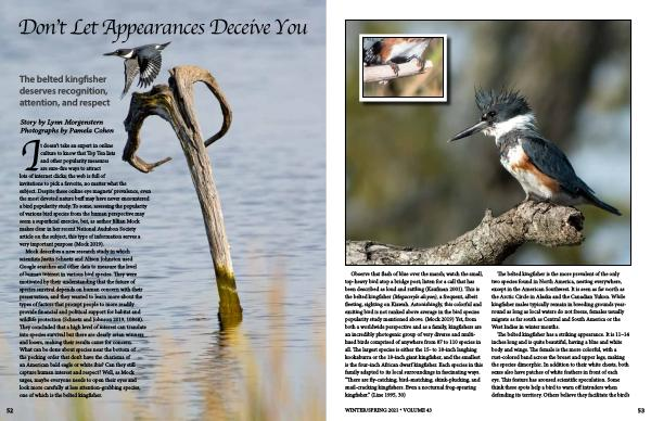 Observe that flash of blue over the marsh ; watch the small , top-heavy bird atop a bridge post ; listen for a call that has been described as loud and rattling ( Kaufman 2001 ). This is the belted kingfisher ( Megaceryle alcyon ), a frequent , albeit fleeting , sighting on Kiawah . Astonishingly , this colorful and exciting bird is not ranked above average in the bird species popularity study mentioned above . ( Mock 2019 ) Yet , from both a worldwide perspective and as a family , kingfishers are an incredibly photogenic group of very diverse and multihued birds comprised of anywhere from 87 to 110 species in all . The largest species is either the 15- to 18-inch laughing kookaburra or the 18-inch giant kingfisher , and the smallest is the four-inch African dwarf kingfisher . Each species in this family adapted to its local surroundings in fascinating ways . “ There are fly-catching , bird-snatching , skink-plucking , and snail-cracking kingfishers . Even a nocturnal frog-spearing kingfisher .” ( Line 1995 , 30 )