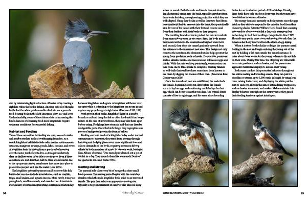Feeding can take much of a kingfisher ’ s day under normal circumstances . However , the period from nesting through hatching and fledging places even more significant time and caloric demands on the birds , requiring strenuous fishing efforts by both members of a pair . In his own work , biologist Dan Albano observed , “ One mated pair cleaned out a pot of 50 fish in a day . They munch them like we munch Doritos .” ( as quoted in Line and Kuhn 1996 ).