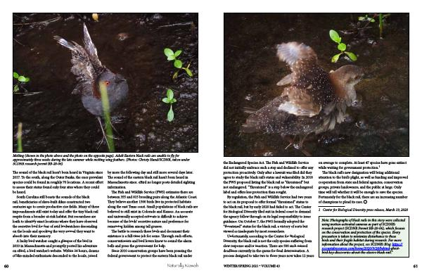 Molting ( shown in the photo above and the photo on the opposite page ). Adult Eastern black rails are unable to fly for approximately three weeks during the late summer while molting wing feathers . ( Photos : Christy Hand / SCDNR , taken under SCDNR research permit BB-20-06 )
