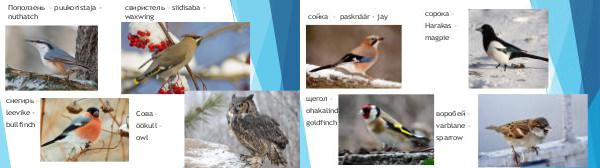 сойка – pasknäär - jay сорока – Harakas – magpie щегол – ohakalind - воробей – goldfinch varblane – sparrow