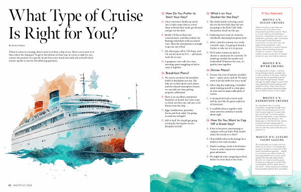 The best part of cruising is knowing that you’ re not alone. Our travel agency is here to support your cruise vacation, from the planning phase— booking the right cabin, shore excursions and specialty dining— to answering any questions while you’ re on board and making sure your flights there and back are lined up perfectly. We can also provide VIP upgrades and bonus amenities at no additional charge, like on Distinctive Voyages cruises( see more about those on page 71). In short, we handle all the details, so you can relax and enjoy your vacation. ■