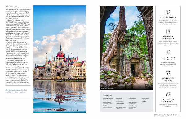Why did we choose to call it NAUTICUS? It is a name with ancient Latin roots, meaning“ of ships,” for that is exactly what we will detail in these pages. The first half of the magazine is dedicated to the experiences you’ ll enjoy on board these relaxing cruise ships, as well as the adventures you’ ll have on shore. We also include a section on our agency’ s Distinctive Voyages program, which includes bonus amenities at no additional charge.