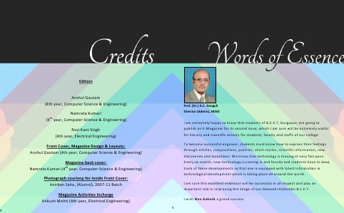 Ravi Kant Singh (4th year, Electrical Engineering) Front Cover, Magazine Design & Layouts: Anshul Gautam (4th year, Computer Science & Engineering) Magazine back cover: Namrata Kumari (4th year, Computer Science & Engineering) Photograph courtesy for inside Front Cover: Anirban Saha, (Alumni), 2007-11 Batch Magazine Activities Incharge Ankush Mohit (4th year, Electrical Engineering)