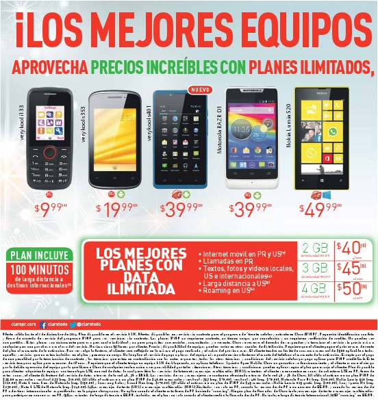 Oferta válida hasta el 1 de diciembre de 2014. Plan disponible en el servicio GSM. Ofertas disponibles en servicio sin contrato para el programa de “trae tu celular y actívate en Claro (BYOP)”. Requerirá identificación con foto